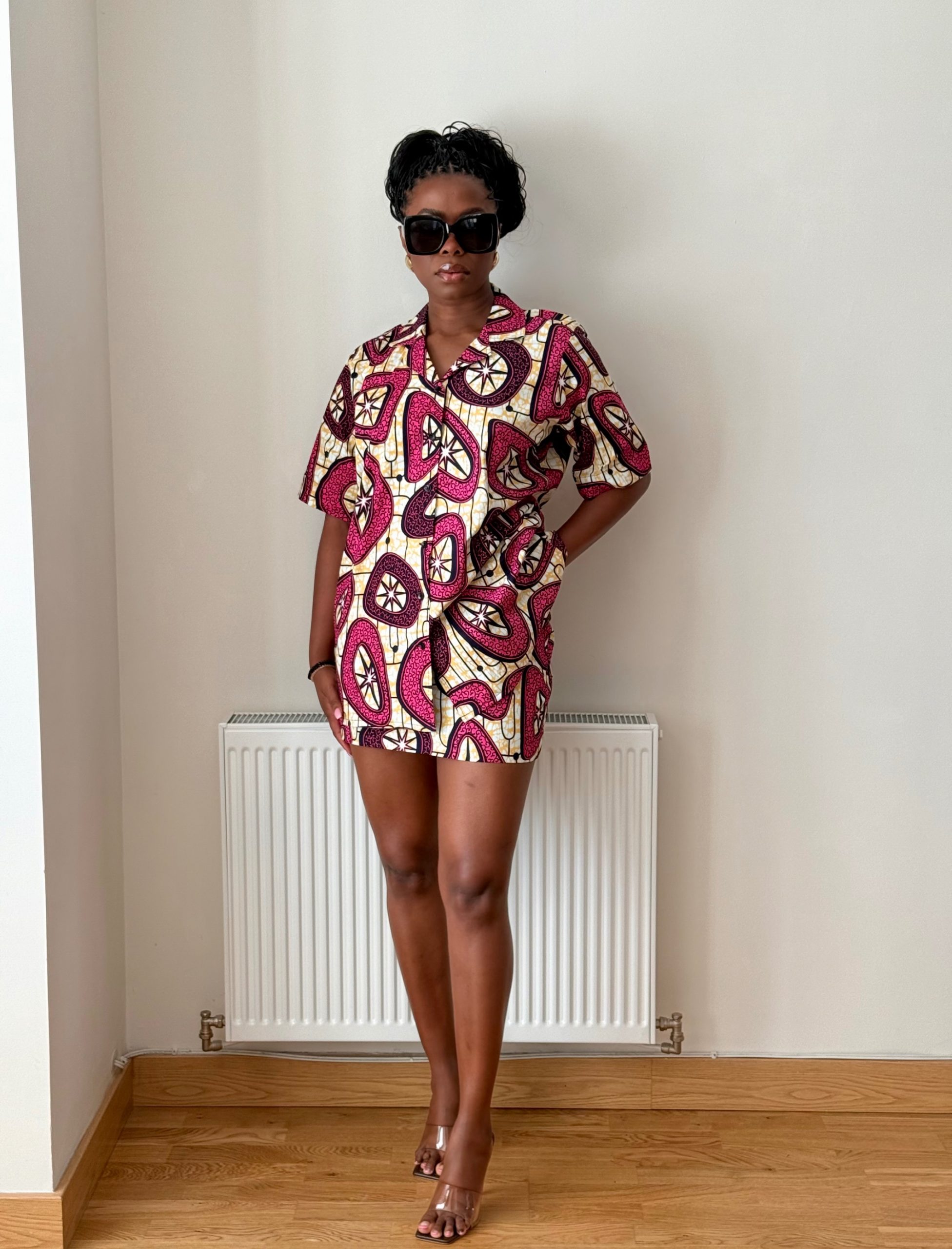 Ankara cotton short-sleeve button-up top and mini skirt set