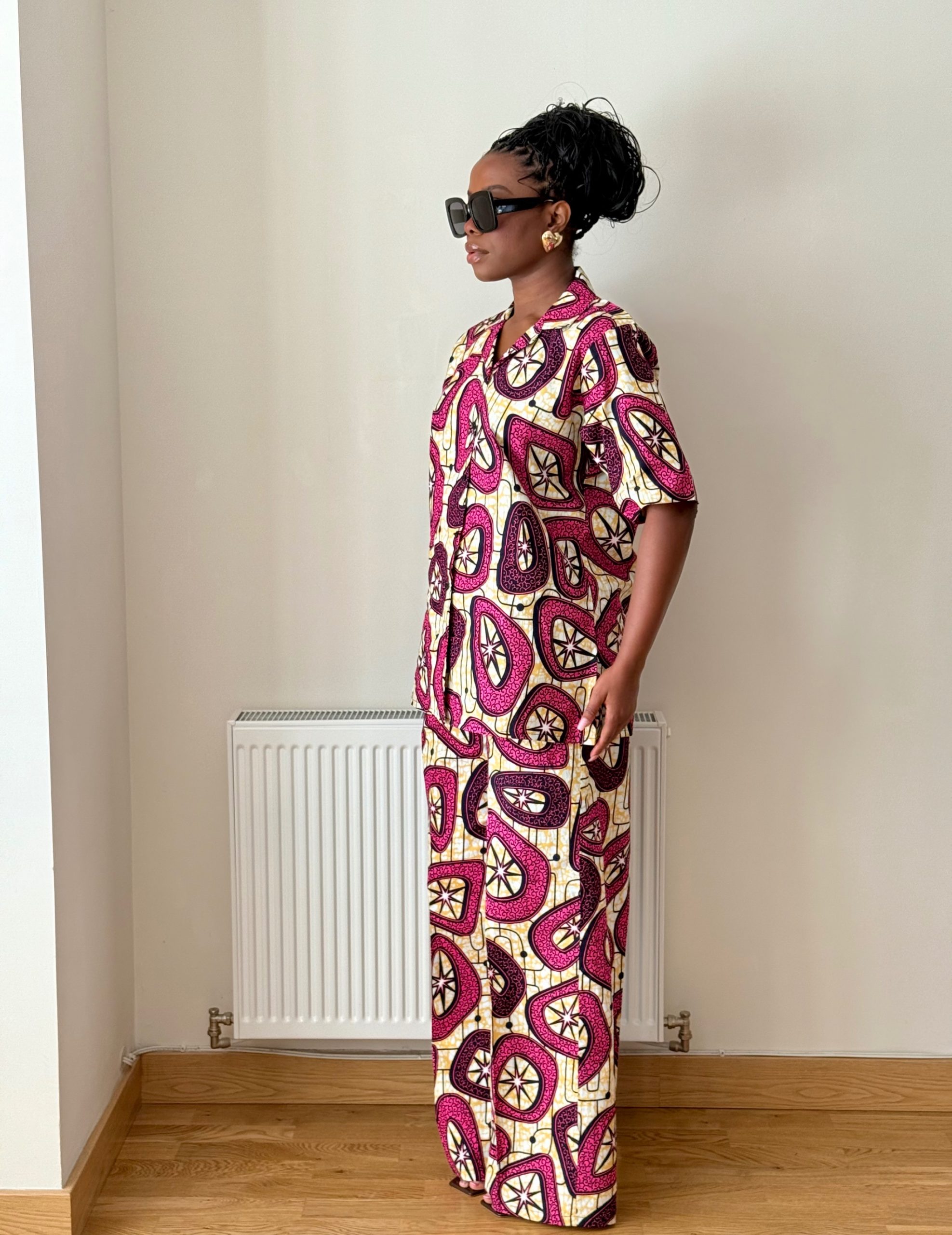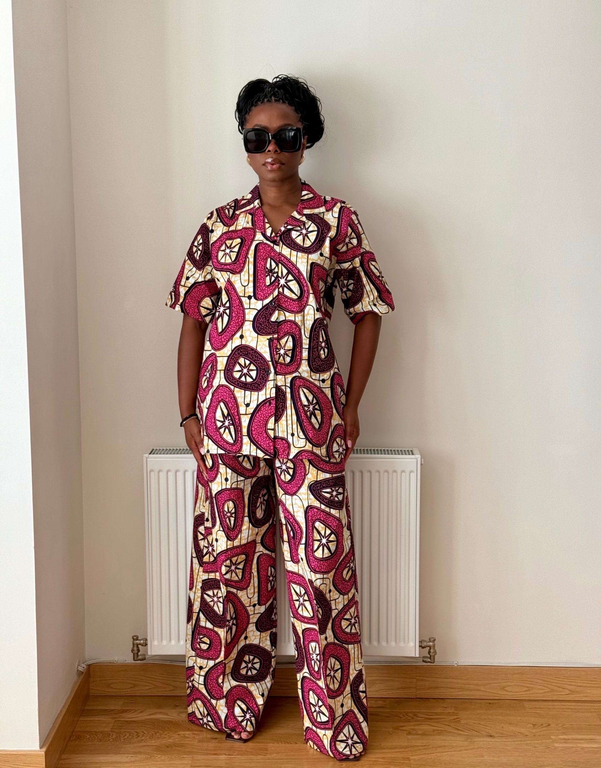 Ankara cotton short-sleeve button-up top and pants set